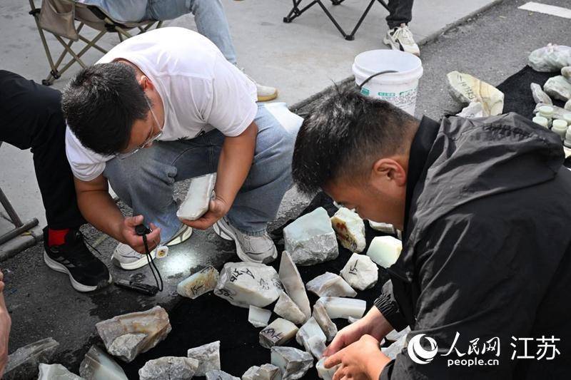 玉石原石交易区,玉石买家正在查看玉石质量。人民网记者 张瀚天摄